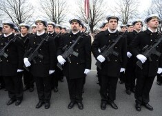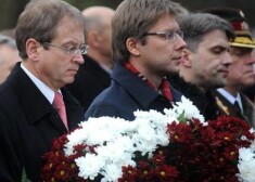 Valsts prezidentam un citām valsts augstākajām amatpersonām, kas šodien vēroja parādi, arī pie apģērba piespraustas lentītes sarkanbaltsarkanā krāsā.