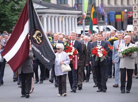 Jau vēstīts, ka Komunistiskā genocīda upuru piemiņas dienas gājienā no Okupācijas muzeja līdz Brīvības piemineklim otrdien bija devušies aptuveni 300 cilvēku. Gājiena dalībnieki nesa Latvijas, Lietuvas un Igaunijas karogus, kā arī ar dzeloņdrāti aptītu baltu krustu.