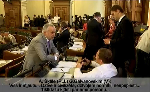 Šķēle Olšteinam un Galvanovskim saka: „Plāns sarežģījies. Tu man pierakstīsi... Konkrētu vajag... Nenobalsos... Ieiet kabīnē un visi samulst. Uzraksti par ko balsoji, parādi, parādi, nu parādi... Klausies, tu tikai nepūties (vai nepūlies) uz ministru, iesim caur šito, man ir otrs priekšlikums.”