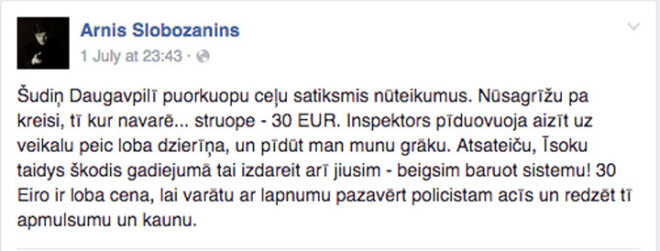 No neapskaužamās situācijas, kurā ceļu policists zem četrām acīm piedāvā apiet likumu un par pārkāpumu samaksāt grādīgajā Arnis gan izgājis godam – viņš pārliecināti noraidījis bezkaunīgo piedāvājumu. “Es atteicos. Iesaku arī jums šādās situācijās rīkoties līdzīgi – beigsim barot korumpēto sistēmu,” savu rīcību pamato autovadītājs, “30 eiro ir laba cena, lai varētu ar lepnumu ielūkoties policista acīs un redzēt tajās apmulsumu un kaunu.”