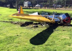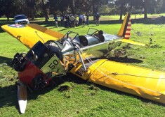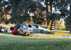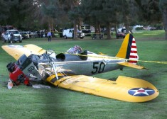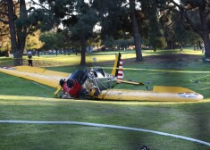Harisona Forda antīkā Otrā pasaules kara gadu lidmašīna 2015. gada. 5. martā Santamonikā, ASV Kalifornijas štatā, veica avārijas nosēšanos ...