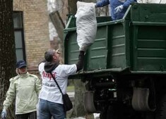 * Rīga, Vecāķi. Cilvēki ap 45, vējains laiks, maisi pildās.