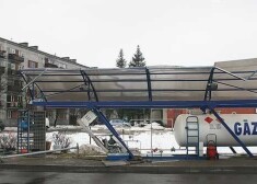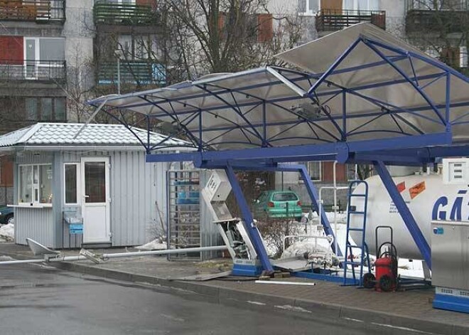Kravas auto vadītājs nav varējis apgriezties un aizķēris gāzes uzpildes stacijas jumtu.