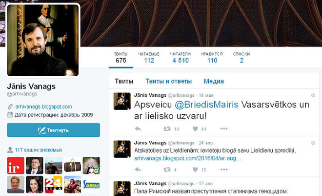 Savukārt savā tvitera kontā arhibīskaps neko nav ierakstījis jau pāris nedēļas. Pēdējais viņa ieraksts datēts Vasarsvētkos – maija vidū, kurā viņš Latvijas labāko bokseri Mairi Briedi apsveic ar Nigērijas boksera Olanrevaja Durodolas pievarēšanu.