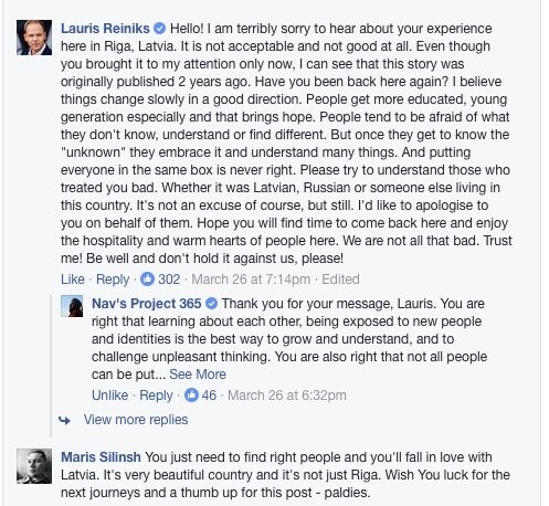 “Domāju, ka aizbraucot uz šī bārdaiņa mītnes valsti, rasisms būtu labākais, ar ko es varētu sastapties, sliktākajā gadījumā es tur būtu vienkārši nozūmēts. Paskatoties, kā šīs svētās govis uzvedas Eiropā, viņi nekādu viesmīlību nav pelnījuši. Tas ir labi, ka Latvijas cilvēkiem ausu muskulatūra ir vāja – tolerastu karinātie makaroni uz viņām neturas,” latviešu valodā atbildot pašam Navjotam, raksta kāds Jānis.