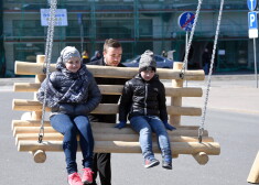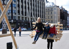 FOTO: Ļaudis Rīgas centrā bauda saulaino dienu, šūpojoties "Jautrajās Lieldienu šūpolēs"