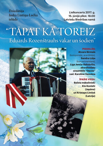 2017.g. 15.06. Latviešu Biedrības namā plkst.18 00 īpašs koncerts "Tāpat kā toreiz…" iezīmē manā koncertorganizēšanas vēsturē absolūti jaunu koncepcijas līniju,jaunu ieceri,kā arī mēģināšu īstenot savu sapni par Eduarda Rozenštrauha tēla atveidi uz skatuves.Tas būs radošs teatralizēts koncerta uzvedums,kurā dominēs Eduards Rozenštrauh tēls (plastiski horeogrāfiskā atveidē) skanot dziesmām un, savelkot satura un biogrāfisko datu paralēles, ar paša komponista personību un sarežģīto dzīvi.