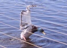 Virs Doles zivjaudzētavas dīķiem izklāti putniem neredzami tīkli, lai karpu kāpurus aizsargātu no zivjēdēju putniem. Spārnaiņi tīklus neredz, sapinas tajos ...