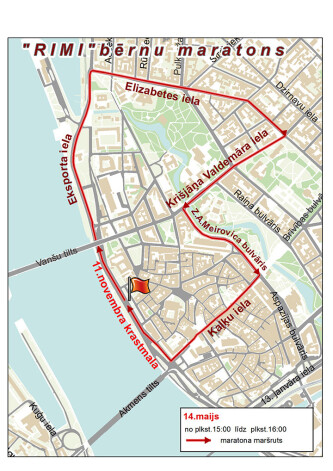 slēgs transportlīdzekļu satiksmi “RIMI” bērnu dienas Ģimeņu skrējiena maršrutā: 11.novembra krastmala – Eksporta iela – Elizabetes iela – Krišjāņa Valdemāra iela – Zigfrīda Annas Meierovica bulvāris – Brīvības bulvāris – Kaļķu iela – 11.novembra krastmala.