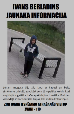 Jau ziņots, ka Valsts policijā svētdien saņemts iesniegums par to, ka sestdien ap plkst.8.30 no savas dzīvesvietas Liepājā, Pāvilostas ielā, izgāja piecgadīgais Ivans Berladins.