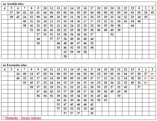 No Mežciema uz Centrālo staciju plkst. 13.26 13.52 14.17 14.43 15.08 15.34 16.00 16.26 16.52 17.17 17.44 18.17 18.48 19.15 19.46 20.06 20.29 20.56 21.18 21.41* 23.04 23.30 23.53 00.22 00.47 01.12 01.32 *līdz pieturvietai “Dzirnavu iela”