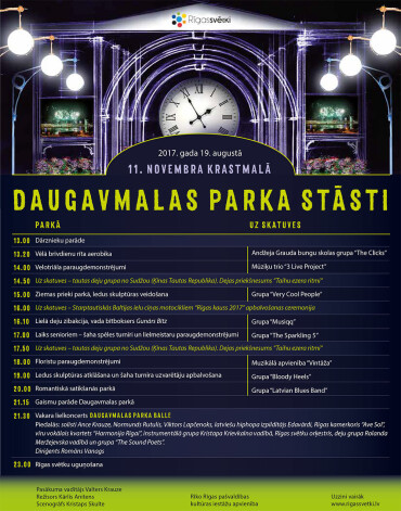 Šogad Rīgas svētku laikā 11. novembra krastmala kļūs par krāšņu parku – sestdien, 19. augustā no plkst. 13.00 līdz pat 23.15 rīdzinieki un pilsētas viesi aicināti uz Rīgas svētku centrālo pasākumu Daugavmalas parka stāsti, kur godā tiks celts tas, kas parkos notiek ikdienā, sākot no parku uzkopšanas un beidzot ar romantiskiem randiņiem vēlā vakara stundā.