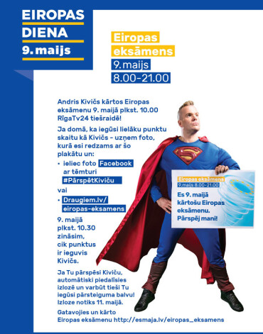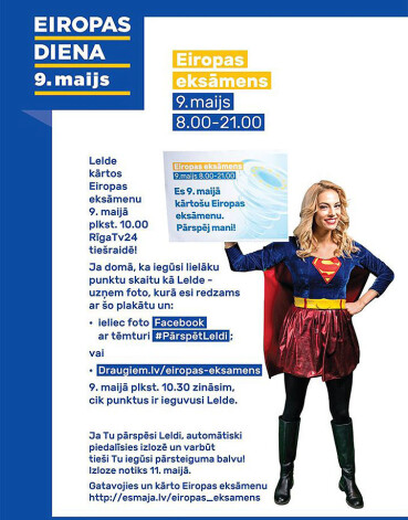 9. maijā, Latvijā un pārējā Eiropas Savienībā, atzīmē Eiropas dienu. Šajā dienā daudzviet Latvijā notiek interesanti pasākumi un kā viens no vērienīgākajiem ir Eiropas eksāmens, kura norisi varēs vērot tiešraidē 9. maijā pulksten 10:00 kanālā RīgaTV 24.