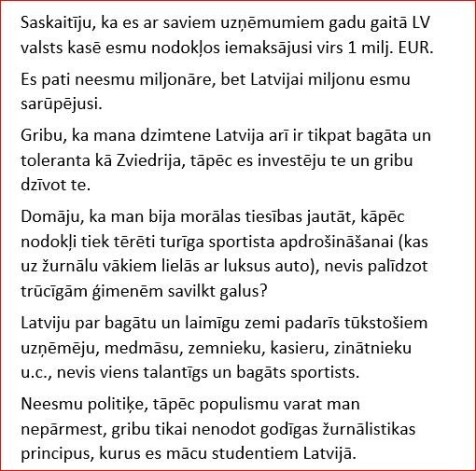 Nevēlos, lai no manas nodokļu naudas maksā gigantiskas summas Porziņģim. LV ir daudz vairāk vajadzību slimajiem, vecajiem, mazturīgajiem.