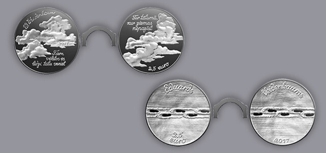 "Saskaņā ar mākslinieka Arvīda Priedītes ieceri abas monētas komplektā veido stilizētas brilles, kas asociējas ar Eduarda Veidenbauma tēlu, kādu to pazīstam no vienīgās autentiskās fotogrāfijas, kas saglabājusies līdz mūsdienām," atzīmēja Latvijas Bankas preses dienestā.