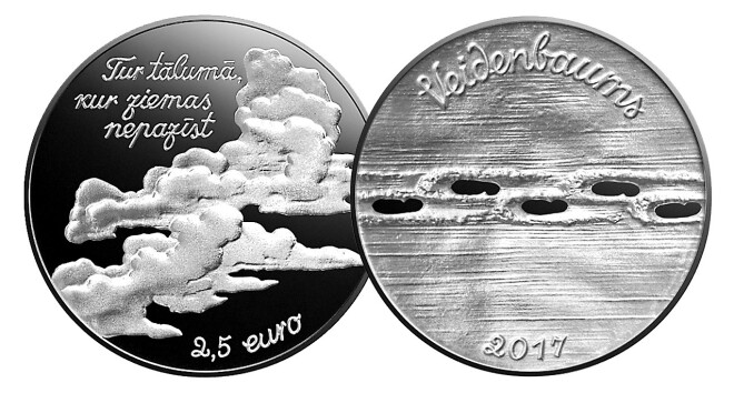 Abu monētu priekšpusē (aversā) attēloti mākoņi. Vienas monētas priekšpusē augšdaļā pa kreisi puslokā ir Veidenbauma paraksta faksimils, bet monētas lejasdaļā ir Veidenbauma dzejoļa rinda "Tiem vēlētos es līdzi tālu skriet…". Otras monētas priekšpusē augšdaļā pa kreisi ir Veidenbauma dzejoļa rinda "Tur tālumā, kur ziemas nepazīst".