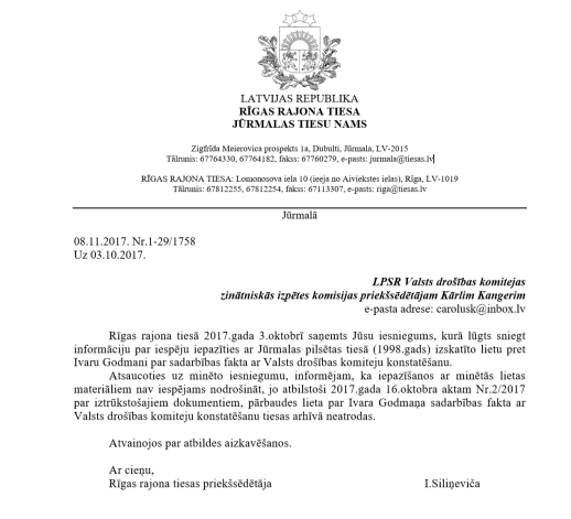 Rīgas rajona tiesa atteikusi sniegt informāciju komisijai, norādot, ka neizsniegs 1990.gada LPSR Augstākās padomes vēlēšanu rezultātā ieceltā ministru padomes priekšsēdētāja Ivara Godmaņa iespējamās sadarbības ar VDK jeb čeku lietu, jo konstatēts, ka šī lieta tiesas arhīvā vairs neatrodas.