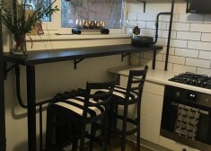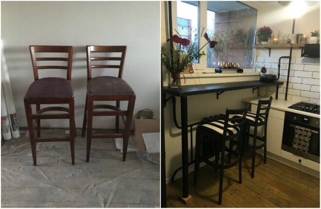 Arī divi bāra krēsli (skat. att.) atjaunoti līdzīgā manierē. „Krēsli krāsoti ar to pašu krāsu, kas izmantota ledusskapim. Audums pirkts veikalā „IKEA”, 5m maksāja 25 eiro. Apvilkšana – onkulis Jelgavā par abiem krēsliem paprasīja 5 EUR. Netici vīriešiem pāri 40, kuri saka, ka padomju mēbeles atjaunot nevar!” paskaidro Ance.