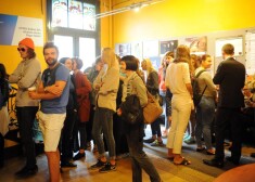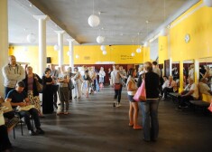 Cilvēki stāv rindā pēc biļetēm uz iestudējuma "Brodskis/Barišņikovs" izrādēm Jaunajā Rīgas teātrī.