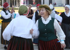 Gājiena dalībniekus ar dziesmām sveica folkloras kopu dalībnieki, kuri turpina muzicēt uz skatuves Brīvības laukumā.