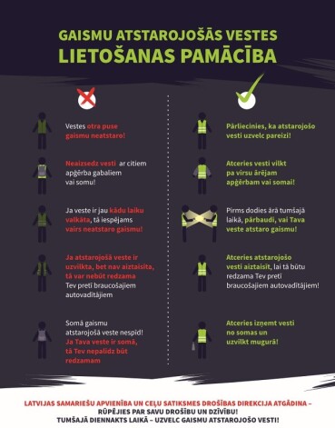 Ceļu satiksmes noteikumi paredz, ka diennakts tumšajā laikā, ja ceļš nav pietiekami un vienmērīgi apgaismots, gājējiem, kas atrodas uz brauktuves vai nomales, jābūt tērptiem atstarojošā vestē vai apģērbā ar labi redzamiem gaismu atstarojoša materiāla elementiem.