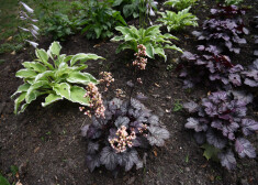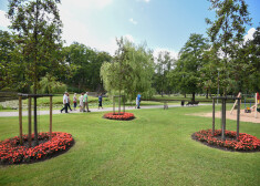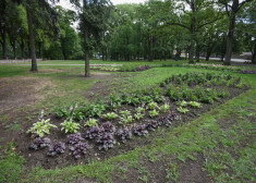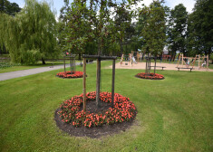 Apstādījumi katru gadu tiek veidoti atšķirīgi, šogad zied samtenes, kohijas, piparmētras, raspodiņš, salvijas, lobēlijas un citas puķes. Pērn vasarā ik pa brītiņam uzlija, šogad visu laiku jālaista, bet arī pārāk lielā saulē to nevar darīt, lai stādījumi neapdeg.