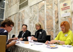 Balsu skaitīšana 13.Saeimas vēlēšanās 142.vēlēšanu iecirknī Rīgas Kongresu namā.