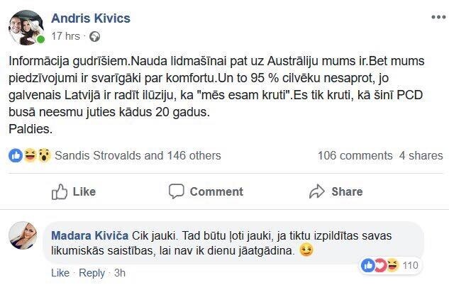 Mūziķis Andris Kivičs, kurš pēdējo nedēļu laikā savu darbību dēļ izpelnījās klaju neslavu, turpina komunicēt ar cilvēkiem sociālajos tīklos par spīti līdzšinējam rezultātam. Nesenākajā “Facebook” ierakstā, kurā Kivičs apliecina, ka kopā ar mīļoto Lieni Skulmi ir ceļā uz Latviju un no naudas trūkuma necieš, no komentāriem nav atturējusies arī mūziķa bijusī – Madara Kiviča.