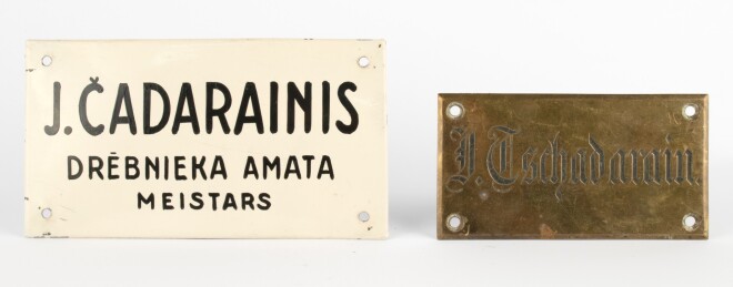 Senākā no tām ar vienkāršu uzrakstu vācu valodā “J. Tschadarain” izgatavota 20. gadsimta sākumā. Otra tapusi, domājams, trīsdesmito gadu otrā pusē ar uzrakstu: “J. Čadarainis, drēbnieka amata meistars”.