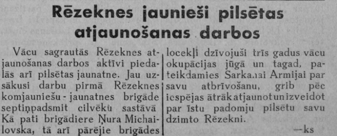 „Vācu sagrautās Rēzeknes atjaunošanas darbos aktīvi piedalās arī pilsētas jaunatne. jau uzsākusi darbu pirmā Rēzeknes komjauniešu-jaunatnes brigāde septiņpadsmit cilvēku sastāvā. Kā pati brigadiere Ņura Michailovska, tā arī pārējie brigādes locekļi dzīvojuši trīs gadus vācu okupācijas jūgā un tagad, pateikdamies Sarkanai Armijai par savu atbrīvošanu, grib pēc iespējas ātrāk atjaunot un izveidot par īstu padomju pilsētu savu dzimto Rēzekni”.