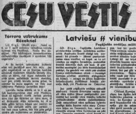 Savukārt “Cēsu Vēstis” publicē vien oficiālās ziņu aģentūras informāciju: “Terora uzbrukums Rēzeknei. Naktī no 6. uz 7. aprīli padomju lidmašīnas nometa bumbas virs Rēzeknes. Radās ēku postījumi. Pēc līdzšinējiem konstatējumiem civiliedzīvotāju zaudējumi ir apmēram 100 nogalinātu. Ar šo terora uzbrukumu boļševiki atkal reiz parādījuši savu īsto seju. Jau gļēvi nogalinājuši vai uz Sibīrijas tundrām aizveduši desmitiem tūkstošu latviešu vīru, sievu un bērnu, viņi tagad nekaunas turpināt savas sadistiskās terora metodes, kaut gan, pretēji latviešu tautas gribai, tie vienmēr no jauna apgalvo, ka mēs esot nešķirama Padomju savienības daļa.