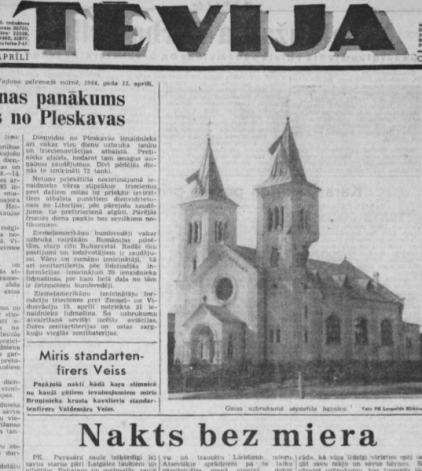 17. aprīlī Rīgā iznākošās “Tēvijas” pirmajā lappusē publicēta saspridzinātās Rēzeknes baznīcas fotogrāfija un reportāža: “Nakts bez miera”: “Uzbrukums pārtraucis dievkalpojumu. Ļaudis, atstājuši dievnamu, steidzas uz patvertnēm, slēpjas vārtu nojumēs un namu trepju telpās. Visapkārt sprāgst bumbas un šķembas Dažādos pilsētas rajonos sāk degt mājas. Ir kļuvis tumšs, un tikai ugunsgrēku blāzma met spokainas ēnas. Šai puskrēslā redzams, kā, neraugoties uz bumbu lietu, pa ielām steidz karavīri un vietējās gaisa aizsardzības darbinieki. Sagrauto namu iemītnieki atstājuši patvertnes steidz glābt, kas glābjams.