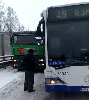 Uzbraucot uz Dienvidu tilta #Rīga #Latvija, satiksmes autobuss aizķer kravas auto un nobloķē pilnībā ceļu. Pasažieri spiesti ar kājām doties pāri tiltam.
