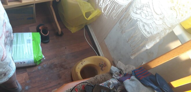Turpinot mājokļa apskati, pamanīts, ka grīdas ir netīras un lipīgas. Uz tām mētājās bērnu krāsojamās grāmatas, izlietotas autiņbiksītes, suņa izkārnījumi un barība. Pa istabu skraidīja divi mazi bērni, kuri burtiski no galvas līdz kājām bija nosmērējušies ar tumšu guaša krāsu. Tāpat ar guaša krāsu bija nosmērētas sienas un mēbeles.
