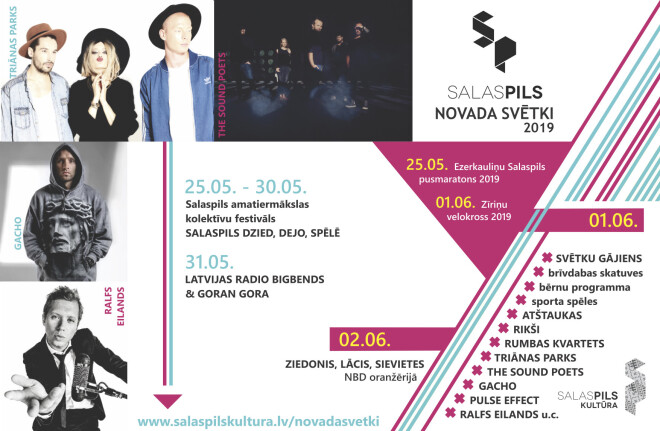 No piektdienas līdz svētdienai, no 31. maija līdz 2. jūnijam, Salaspils ar krāšņu programmu svinēs Novada svētkus, uz kuriem aicina gan pilsētas iedzīvotāju, gan viesus. 31. maijā svētkus atklās Latvijas Radio bigbenda un Goran Gora koncerts, 1.jūnijā Nacionālajā botāniskajā dārzā uzstāsies „Triānas parks”, „The Sound Poets”, „DaGamba”, Gacho, „Pulse Effect”, Ralfs Eilands un Dj Artūrs Mednis, bet 2. jūnijā būs Kārļa Lāča programma “Ziedonis. Lācis. Sievietes”.