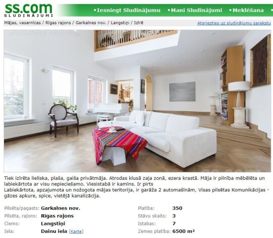 Sludinājumā teikts, ka tiek izīrēta "lieliska, plaša, gaiša" privātmāja, kas atrodas klusā zaļa zonā, ezera krastā. Māja ir pilnība mēbelēta un labiekārtota ar visu nepieciešamo, norādīts sludinājumā. Tāpat minēts, ka viesistabā ir kamīns, īpašumā ir arī pirts, ir labiekārtota, apzaļumota un nožogota mājas teritorija, garāža divām automašīnām un visas pilsētas komunikācijas - gāzes apkure, spice, vietējā kanalizācija.