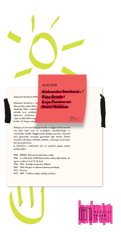 Izstāžu cikls “LMA100” MVT Vasaras mājā turpināsies ar izstādi Fonda “Mākslai vajag telpu” rīkotais izstāžu cikls “LMA100” MVT Vasaras mājā ir veltīts Latvijas Mākslas akadēmijas simtgadei, īpaši izceļot tos māksliniekus, kas savulaik ir saistījuši savu dzīvi ar LMA. Otrā “LMA100” izstāde veltīta slavenajam māksliniekam Aleksandram Stankevičam, kas latviešu mākslas vēsturē atstājis sevišķu nospiedumu tieši grafikas mākslā, veidojot ilustrācijas daudzām daiļliteratūras un dzejas grāmatām. Stankevičs zināms ar to, ka uzticēto grāmatu ilustrējot, viņš centies to izveidot kā vienotu literatūras un mākslas ansambli. Bijis LMA pasniedzējs, darbojies arī interjera dizainā, veidojot vairāku sabiedriski nozīmīgu telpu interjerus, nodarbojās ar glezniecību un zīmējis karikatūras. Vadīt interpretāciju par šo mākslinieku lūgta LMA Grafikas nodaļas pasniedzēja Rūta Briede, kas savā radošajā komandā uzaicinājusi strādāt LMA studentus Eviju Pintāni, Svenu Neilandu un Grafikas katedras metodiķi, mākslinieci Annu Zvaigzni.