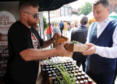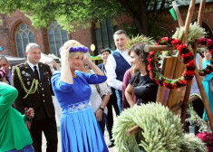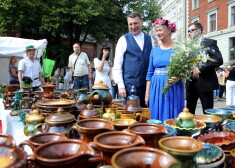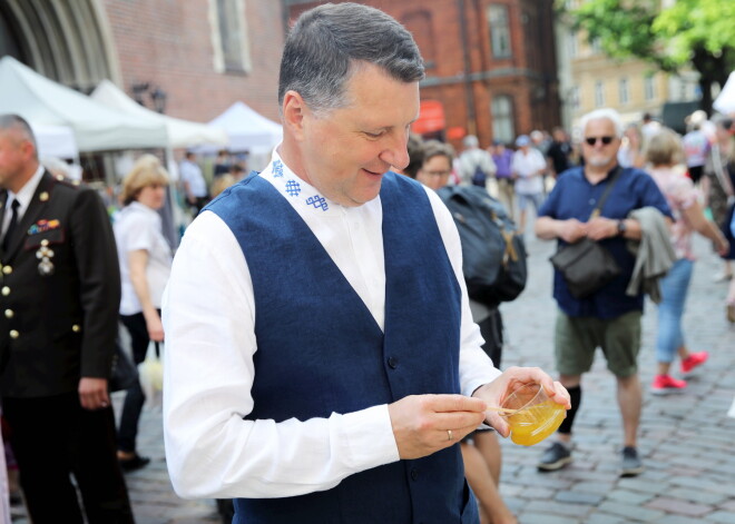 Tautiski ģērbtais Vējoņu pāris apmeklē tradicionālo Zāļu tirgu
