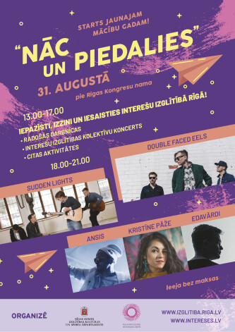 Rīgas domes Izglītības, kultūras un sporta departaments (RD IKSD) sadarbībā ar Rīgas Interešu izglītības metodisko centru aicina 31. augustā bērnus un jauniešus kopā ar vecākiem, vecvecākiem un draugiem uz ikgadējiem mācību gada sākuma svētkiem „Nāc un piedalies!” Svētki visas dienas garumā notiks pie Rīgas Kongresu nama. Ieeja bez maksas.