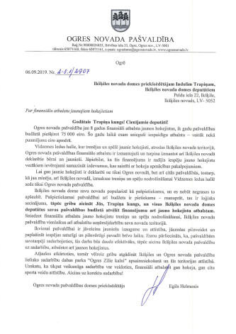 Ogres novada pašvaldības domes priekšsēdētājs Egils Helmanis aicina vistuvākos kaimiņus – Ikšķiles novada pašvaldības vadību arī sniegt finansiālu atbalstu jaunajiem hokejistiem.