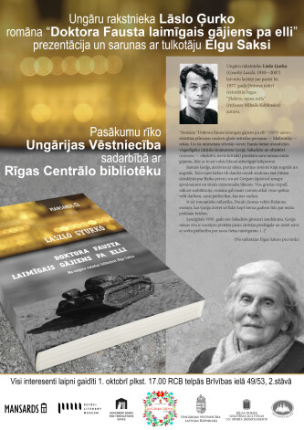 1.oktobrī plkst. 17.00 Ungārijas vēstniecība sadarbībā ar Rīgas Centrālo bibliotēku rīkos ungāru rakstnieka Lāslo Ģurko romāna “Doktora Fausta laimīgais gājiens pa elli” prezentāciju, portālu Jauns.lv informēja Rīgas Centrālā bibliotēkā
