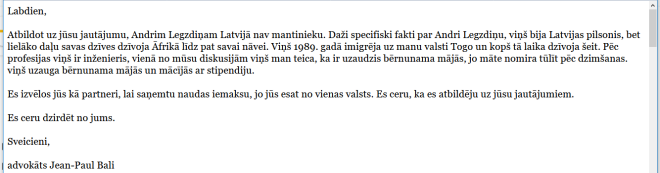 „Atbildot uz jūsu jautājumu, Andrim Legzdiņam Latvijā nav mantinieku. Daži specifiski fakti par Andri Legzdiņu, viņš bija Latvijas pilsonis, bet lielāko daļu savas dzīves dzīvoja Āfrikā līdz pat savai nāvei. Viņš 1989. gadā imigrēja uz manu valsti Togo un kopš tā laika dzīvoja šeit. Pēc profesijas viņš ir inženieris, vienā no mūsu diskusijām viņš man teica, ka ir uzaudzis bērnunama mājās, jo māte nomira tūlīt pēc dzimšanas. Viņš uzauga bērnunama mājās un mācījās ar stipendiju”.