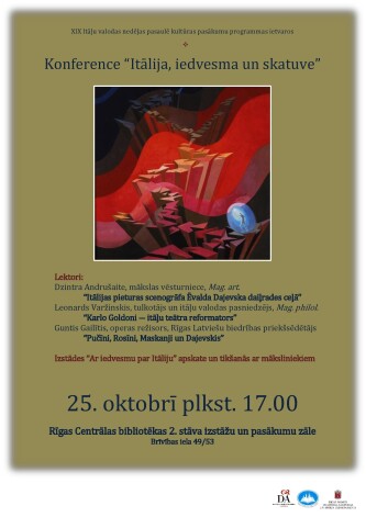25. oktobrī plkst. 17.00 Rīgas Centrālās bibliotēkas 2. stāva izstāžu un pasākumu zālē Brīvības ielā 49/53 notiks Dantes Aligjēri biedrības Latvijā organizētā konference “Itālija, iedvesma un skatuve”. Tās laikā aicinām arī apskatīt izstādi “Ar iedvesmu par Itāliju” un tikties ar māksliniekiem. Tikšanās noritēs XIX Itāļu valodas nedēļas pasaulē kultūras pasākumu programmas ietvaros, portālu Jauns.lv informēja Rīgas Centrālā bibliotēkā.