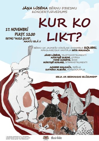Svētdien, 17. novembrī plkst. 12.00 "Mazajā ģildē" izskanēs aizraujošs Jāņa Lūsēna bērnu dziesmu koncertuzvedums "Kur ko likt? ". Tas būs bērnu un jauniešu vokālā ansambļa "Kolibri" veltījums Latvijai un komponistam Jānim Lūsēnam viņa jubilejas gadā. Ar "Kolibri" (mākslinieciskā vadītāja Inita Malnača) kopā noslēpumu par nezināma autora dienasgrāmatu šķetinās komponists Jānis Lūsēns (taustiņinstrumenti), Mārtiņš Sliede (ģitāra), Toms Kursītis (bass) un Mārtiņš Kokars (sitaminstrumenti). Uzveduma režisore Agnese Malnača, horeogrāfe Katrīna Albuže. Koncertuzvedumā skanēs komponista Jāņa Lūsēna dziesmas bērniem ar izcilu latviešu dzejnieku – Ojāra Vācieša, Leona Brieža, Pētera Brūvera un Viļa Plūdoņa dzeju.