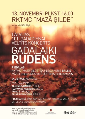 Latvijas valsts svētku svinības Mazajā ģildē kulmināciju piedzīvos pirmdien, 18. novembrī plkst. 16.00 ar jauniešu kora "Balsis" koncertu "Gadalaiki. Rudens", kurā tiks atskaņoti vairāki cikli – Artura Maskata a cappella cikls, Valta Pūces cikla daļas, kuru atskaņošanā piedalīsies komponists Valts Pūce un stīgu kvartets. Kā īpaša odziņa šim svētku koncertam būs instrumentālais Jāņa Ivanova "Otrais stīgu kvartets". Koncertā piedalīsies jauniešu koris "Balsis" (mākslinieciskais vadītājs Ints Teterovskis), koncerta skanējumu papildinās komponists Valts Pūce (klavieres), un stīgu kvartets (Aleksejs Bahirs (vijole), Raimonds Melderis (vijole), Arigo Štrāls (alts), Ainārs Paukšēns (čells)).