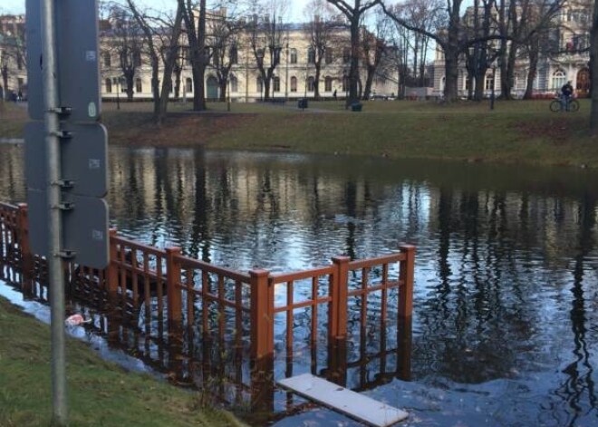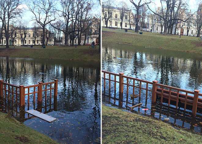 „Šorīt pamanīju, ka liela daļa soliņu gar Rīgas kanālu Bastejkalnā ir gandrīz zem ūdens. Skats jau visai amizants – pīles, šķiet, sapriecājušās par jauno teritoriju un lavierē starp koka režģiem, kamēr cilvēki vienkārši stāv malā un uz to noraugās. Taču kaut kā nepatīkami, ka visādi citādi skaistais parks tādējādi tiek piemēslots, jo ūdens pacēlis un krastā izstūmis arī dažādus atkritumus,” par novēroto stāsta Krišjānis.