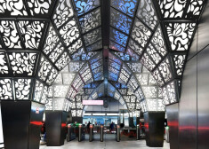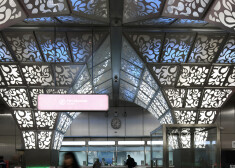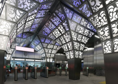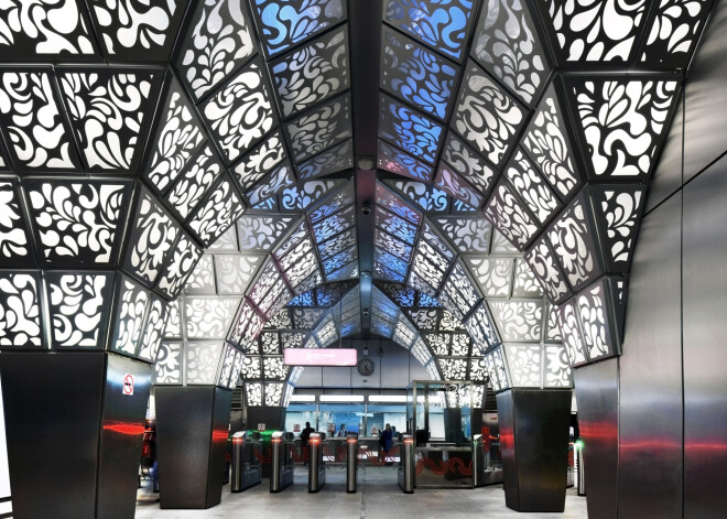 “Tā, piemēram, peronu zālē griesti ir plakani, bet vestibilā tie veidoti kā velves, piešķirot telpām dažādas noskaņas,” stāsta Leonovs, “šīs stacijas griesti vienlaicīgi ir gan dekoratīvs, gan funkcionāls elements, kuros apslēptas inženierkomunikācijas, savukārt LED ļauj griestus izgaismot dažādās krāsās, kas viena otru nomaina. Tas atdzīvina vidi. Atsevišķi gribas izcelt universālo ornamentu, kurā katrs apmeklētājs var saskatīt kaut ko savu – vienam tie ir etniski ornamenti, citam pāva spalvu motīvi vai koku lapas. Šāds personalizēts un drosmīgs risinājums ir māksliniecisks, vizuāli spēcīgs un atmiņā paliekošs. Turklāt ornaments tika izstrādāts tā, lai metāla perforācijā neuzkrātos putekļi – tas ir ļoti svarīgi tādā telpā kā metro”.
