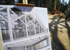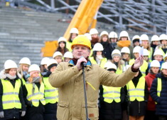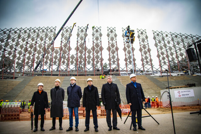 Atzīmējot jaunās Mežaparka Lielās estrādes būvdarbu apjomīgākās daļas pabeigšanu, trešdien, 8. janvārī, virs estrādes kupola metāla konstrukcijām tika svinīgi pacelts spāru vainags.