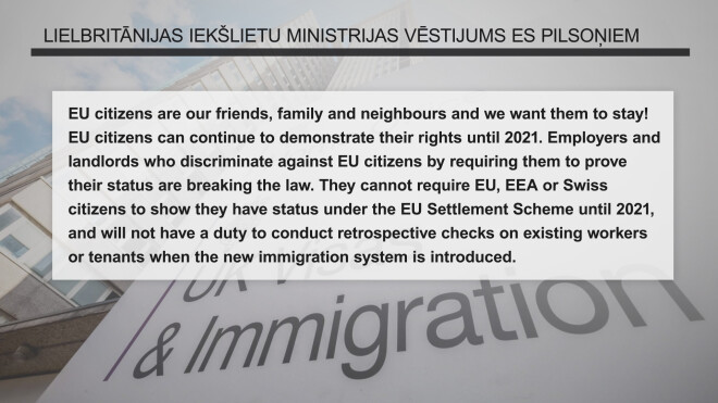 "ES pilsoņi ir mūsu draugi, ģimenes un kaimiņi, un mēs vēlamies, lai viņi turpina šeit palikt! ES pilsoņiem būs visas līdzšinējās tiesības līdz 2021.gadam. Darba devēji un mājokļu izīrētāji, kuri diskriminē ES pilsoņus ar statusa pierādīšanu jau šobrīd, pārkāpj likumu. Līdz 2021.gadam viņi nedrīkst pieprasīt uzrādīt statusu, bet, kad spēkā stāsies jaunā imigrācijas sistēma, nebūs pienākuma veikt pārbaudes par jau līdzšinējiem darbiniekiem vai īrniekiem."