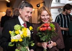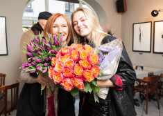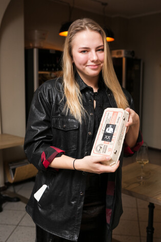 FOTO: Jasmīnu Simsoni gleznu izstādes atklāšanā Mārtiņš Rītiņš apdāvina ar olām